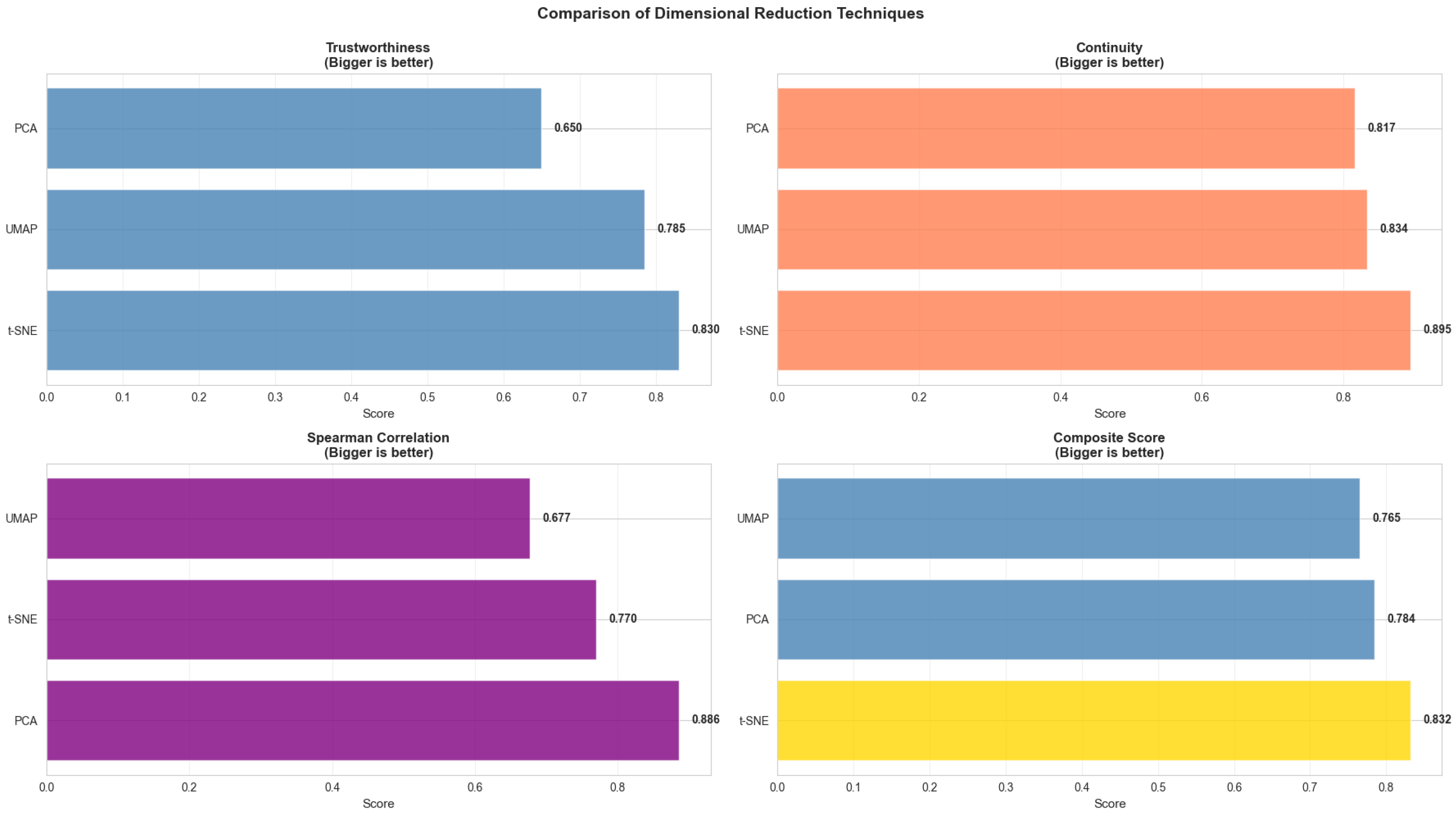 The normalized composite scores, integrating all evaluation metrics, ranked t-SNE as the highest-performing technique for two-dimensional visualization (composite score = 0.834), followed by PCA (0.786) and UMAP (0.766), as reported in