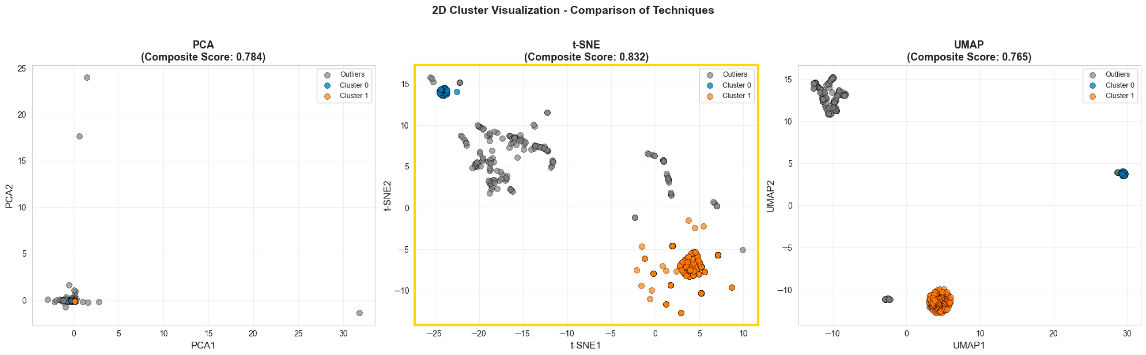 The use of dimensionality reduction techniques supported the qualitative interpretation of the clustering results by providing intuitive two-dimensional representations of the high-dimensional financial space. While visual compactness varied across methods, the selected visualization approach facilitated the identification of cluster separation, internal dispersion, and the spatial positioning of outliers. Importantly, visualization was used as a complementary interpretative tool rather than as a criterion for defining clusters, preserving methodological rigor.