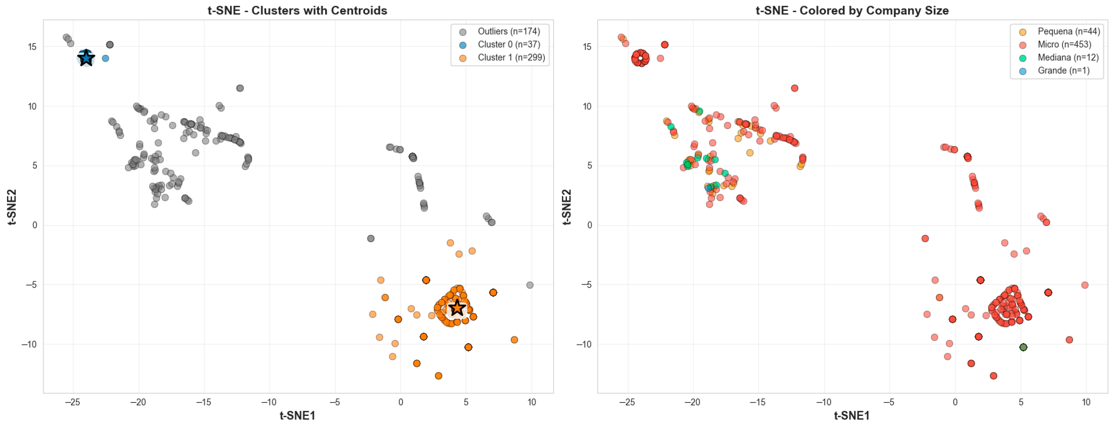 A relevant contribution of this study is the empirical confirmation that firm size does not drive the observed segmentation. Despite the predominance of micro-sized enterprises in both regular clusters, the identified profiles exhibit substantially different financial configurations, reinforcing the value of behavior-based segmentation approaches for analyzing heterogeneous sectors.