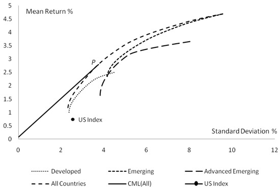 We note that the US is excluded from the optimal portfolio of the All-Country frontier. This can be attributed to a low US average return (0.7%) and high correlations between the US and almost every country in the sample. Hence, despite the low risk accruing to US investment in the pre-crisis period, the inclusion of the US appears neither to increase the return nor reduce the risk of the optimal portfolio. The gains from international diversification are therefore very large for a US investor, with a potential increase of 181% in return per unit of risk made available by shifting from domestic investment (Sharpe ratio of 0.26) to the All-Country optimal portfolio (Sharpe Ratio of 0.73). Interestingly, the diversified portfolio of emerging market indices outperforms the internationally diversified portfolio for both the developed and advanced-emerging subsamples. Hence it is clear that in the pre-financial crisis period the potential gains arising from investment in emerging countries were substantial.