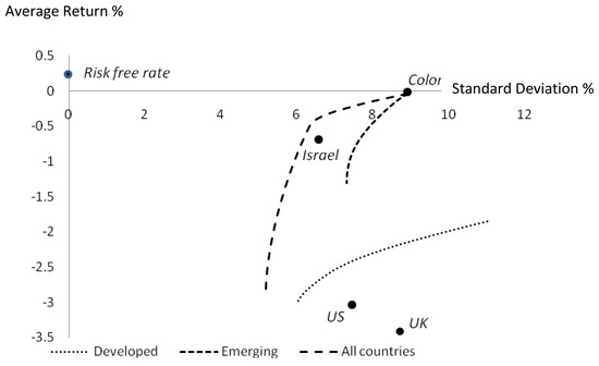 Figure 2 displays the impact of the crisis on the global financial system. With short sales prohibited, no combination of equity indexes can produce a positive return (every efficient frontier lies beneath the horizontal axis). The efficient frontier for the advancedemerging countries is a single point, representing a 100% weighting in Israel (which has a substantially lower standard deviation than other countries of the sample group – of course, a larger sample of countries might have yielded positive weights on other countries).