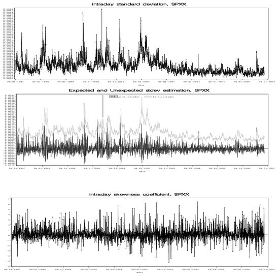 where the dependent variable is the excess return of the indexes at day t; the regressors are the expected volatility, , measured by the expected intraday standard deviation;2 is the unexpected volatility, measured by the unexpected intraday standard deviation; and Skt is the intraday skewness coefficient. If the test result shows β1>0, then the evidence supports the hypothesis that there is a tradeoff between excess returns and expected risk.