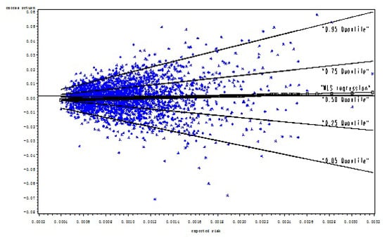 To detect a more precise data range for the validity of the null hypothesis, we use the quantile regression method to examine the risk-return relation. The method, introduced by Koenker and Bassett (1978), allows us to explore the full spectrum of the conditional quantiles for examining the contemporaneous relation between excess returns and expected risk. Specifically, instead of modeling the “mean” of the excess returns based on a least squares approach, a quantile regression method estimates models in which quantiles of the conditional distribution of the excess returns are expressed as functions of observed covariates. From an econometric point of view, the quantile regression is superior to mean-based estimation procedures such as a weighted least squares (WLS) regression in the following two respects. First, the results derived from a least squares regression method lack robustness, producing an ambiguous functional relation between excess returns and risk. A stock return series is notorious for containing extreme values due to erratic market reaction to news, giving rise to a non-Gaussian error distribution. Quantile regression helps to alleviate estimation problems related to the impact of outliers and the fat-tailed error distribution. Second, quantile regression covers the entire quantile spectrum of the dependent variable, showing different behavioral variations along with explanatory variables. This flexibility of modeling cannot be attained with a least squares regression method, since it provides only a mean estimate.