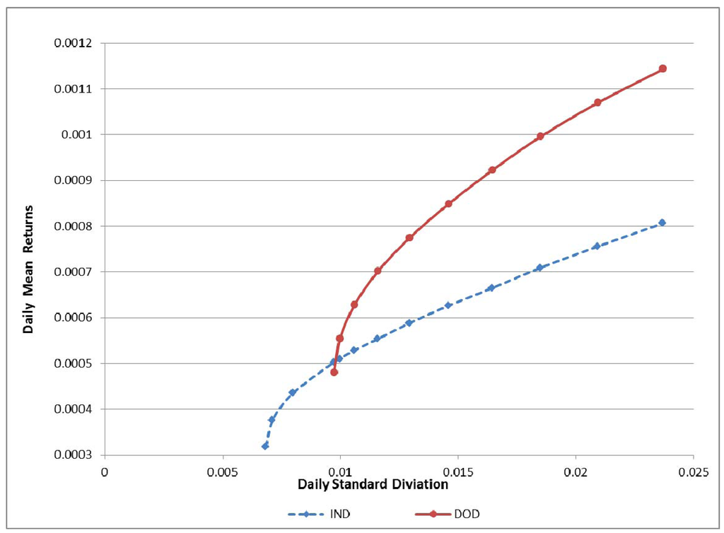 We turn now to comparing the efficient frontiers of the DOD and IND from Figure 1. Since the efficient frontiers of the DOD and IND cross, applying the MV optimization rule to different efficient frontiers leads us to conclude that the DOD and IND do not dominate each other in the entire risk-return range. To be more specific, by adopting the MV optimization approach, we observe from Figure 1 that for any risk level less than 1%, the IND strategy clearly dominates the DOD strategy, but the dominance relationship is reversed for any risk level greater than 1%. This implies that the question of diversifying internationally or domestically would not have a unique answer for US investors and the answer would depend on what level of risk they want to take and what level of return they would like to get. If investors are willing to accept a risk level above 1%, the DOD strategy is a better choice. On the other hand, if they are only willing to accept a risk level up to 1%, the IND strategy is the better choice for them.