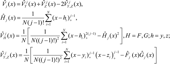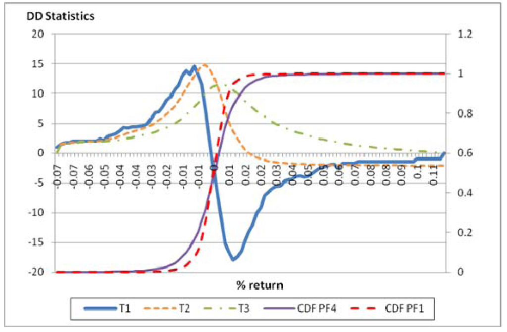 For any two domestically and internationally diversified portfolios Y and Z with CDFs F and G, respectively, and for a grid of pre-selected points x1, x2… xk, the order-j DD statistic, Tj(x) (j = 1, 2, and 3), is: