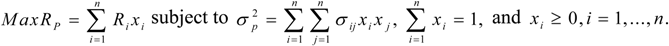 . More precisely, assuming that there are n assets, we denote Ri to be the expected return of asset i and σij to be the covariance of returns between asset i and asset j for i,j = 1,…, n. Given the required level of risk,