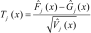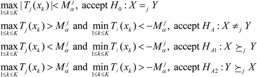 in which Fj and Gj are defined in (1), and (x)+ = {x,0}.It is empirically impossible to test the null hypothesis for the full support of the distributions. We test the null hypothesis for a pre-designed finite numbers of values x. Specifically, the following hypotheses are tested: