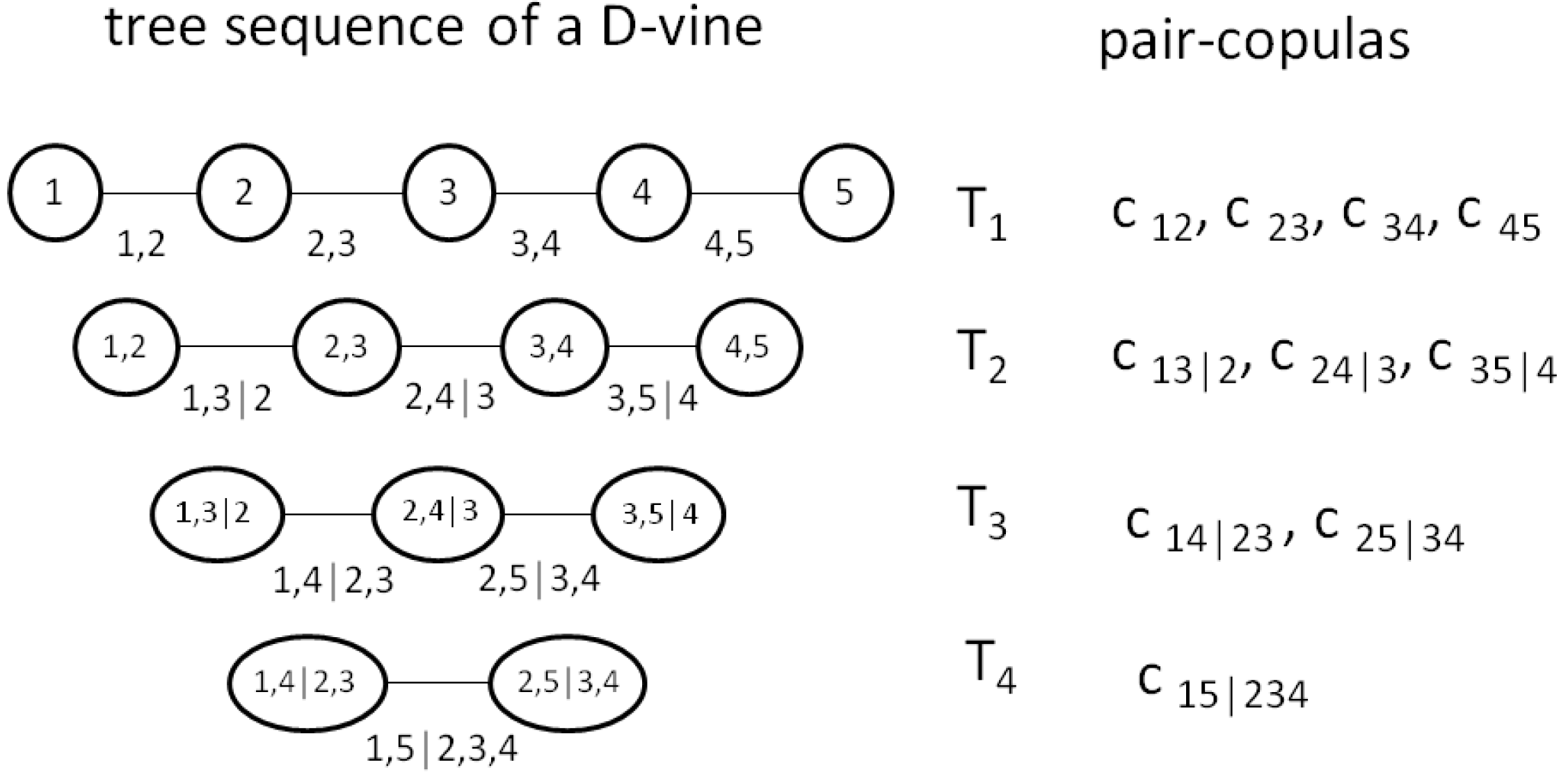 Figure 1 shows the set of trees with corresponding pair-copulas of a five-dimensional D-vine. Tree