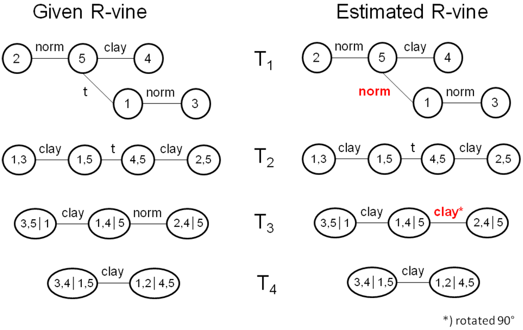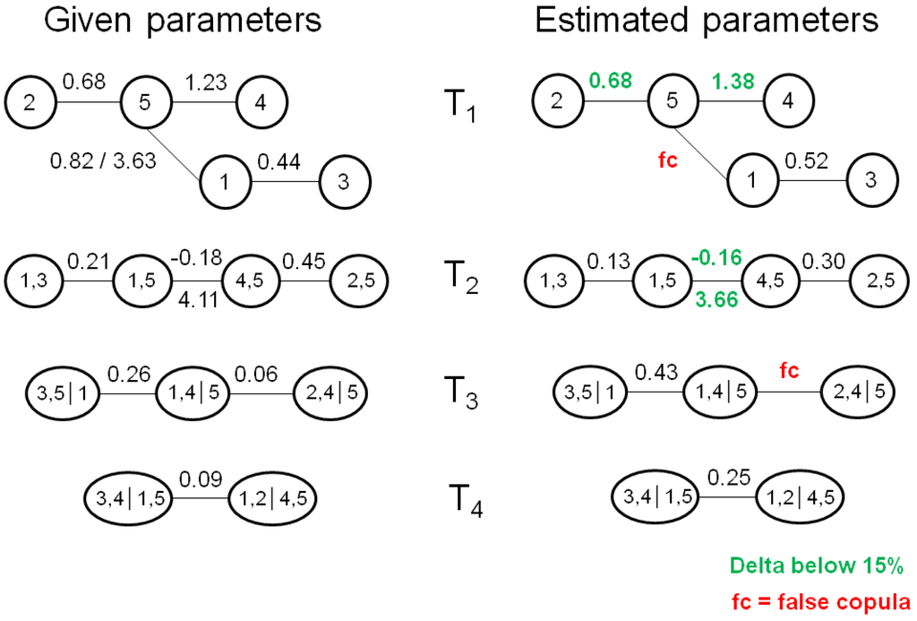To check whether the vine copula calibration concept from Section 2 is feasible, we conduct a simulation experiment in which we sample from a known vine copula, apply the estimation approach to the sampled values and compare the known with the fitted vine copula. As in real life, the model user neither knows tree structure nor bivariate copula families nor bivariate copula parameters (bivariate copula families are a little exception in this regard as we restrict ourselves to the Gauss, t and Clayton family). Given the abundance of possible vine structures to sample from, we want our simulation experiment to mimic a realistic setting. Therefore, we choose five companies randomly from the Euro Stoxx 50, fit an R-vine to their equity time series and use the resulting R-vine as the known copula in the simulation experiment (chapter 5 will show that R-vines are superior to D-vines, which is why we restrict the simulation study to R-vines). By doing so, we ensure using a realistic tree structure with realistic copulas and parameters. It turns out that all three copula families are included in the known copula. We generate 150 samples from the known vine copula, as this a realistic number of observations. The left side of Figure 2 shows the given vine structure from which we draw 150 samples, while the right side shows the vine structure which results from fitting an R-vine to the 150 observations. The estimated tree structure is identical to the given one, which is actually quite remarkable given that there are 480 different R-vines on five variables. In addition, the selected bivariate copula families are also pretty close to the known ones, as eight out of ten bivariate copula families are correctly estimated. Next, we compare the parameters of the bivariate copulas from the given copulas with the estimated ones (see Figure 3). Especially in the ground level trees, and , the parameter match is rather good, while the deviations increase as we move to the top level trees. The largest parameter deviation appears for the top level tree, , in which the real Clayton parameter is overestimated quite a bit (0.06 vs. 0.25). We highlighted parameter deviation of less than 15% in green.