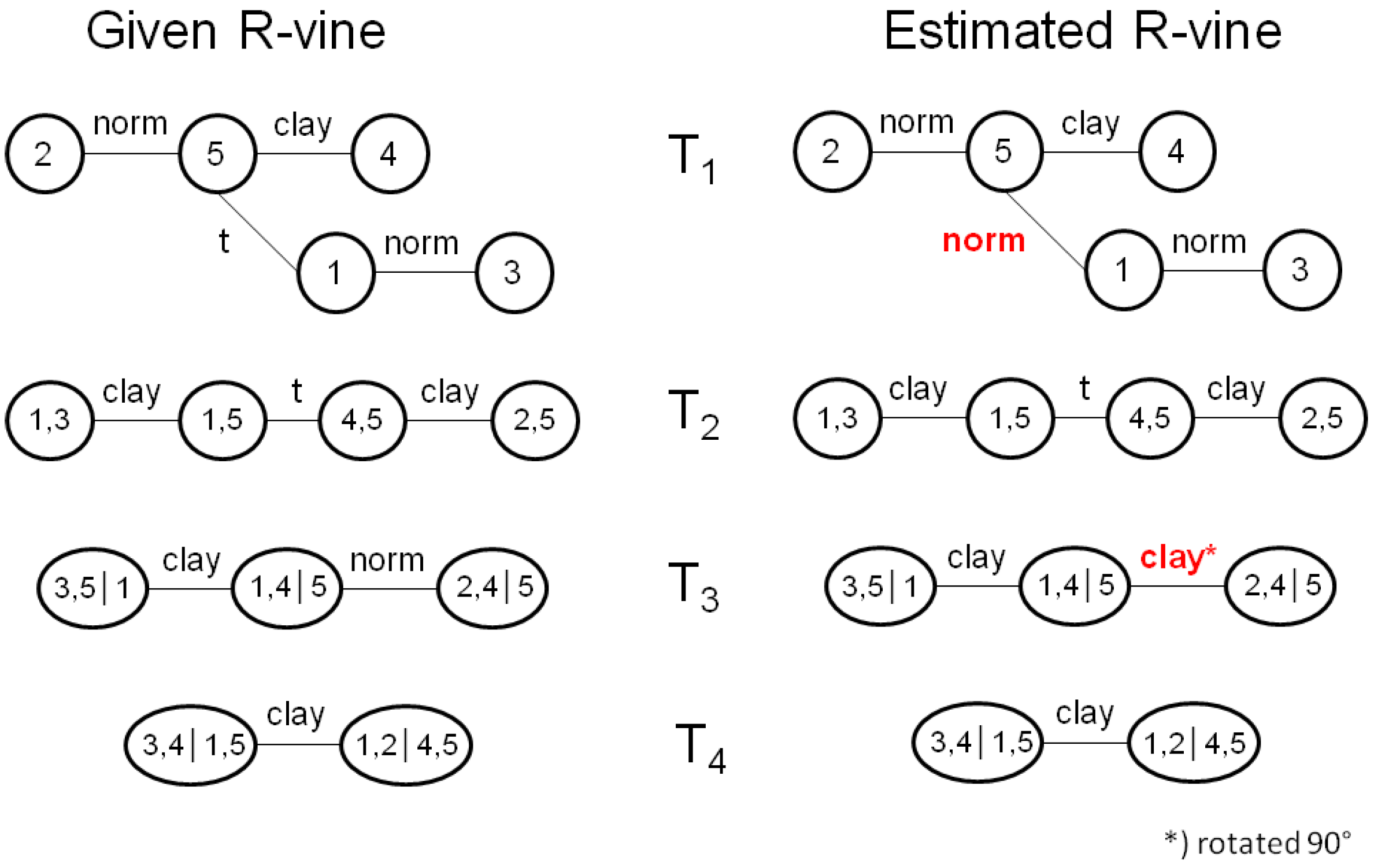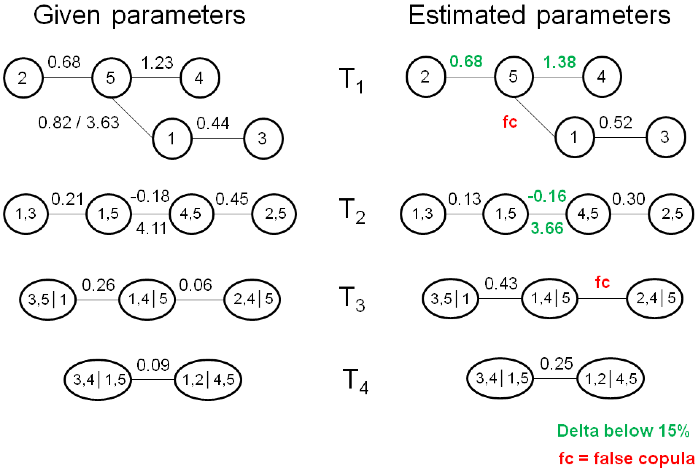 Figure 2 shows the given vine structure from which we draw 150 samples, while the right side shows the vine structure which results from fitting an R-vine to the 150 observations. The estimated tree structure is identical to the given one, which is actually quite remarkable given that there are 480 different R-vines on five variables. In addition, the selected bivariate copula families are also pretty close to the known ones, as eight out of ten bivariate copula families are correctly estimated. Next, we compare the parameters of the bivariate copulas from the given copulas with the estimated ones (see
