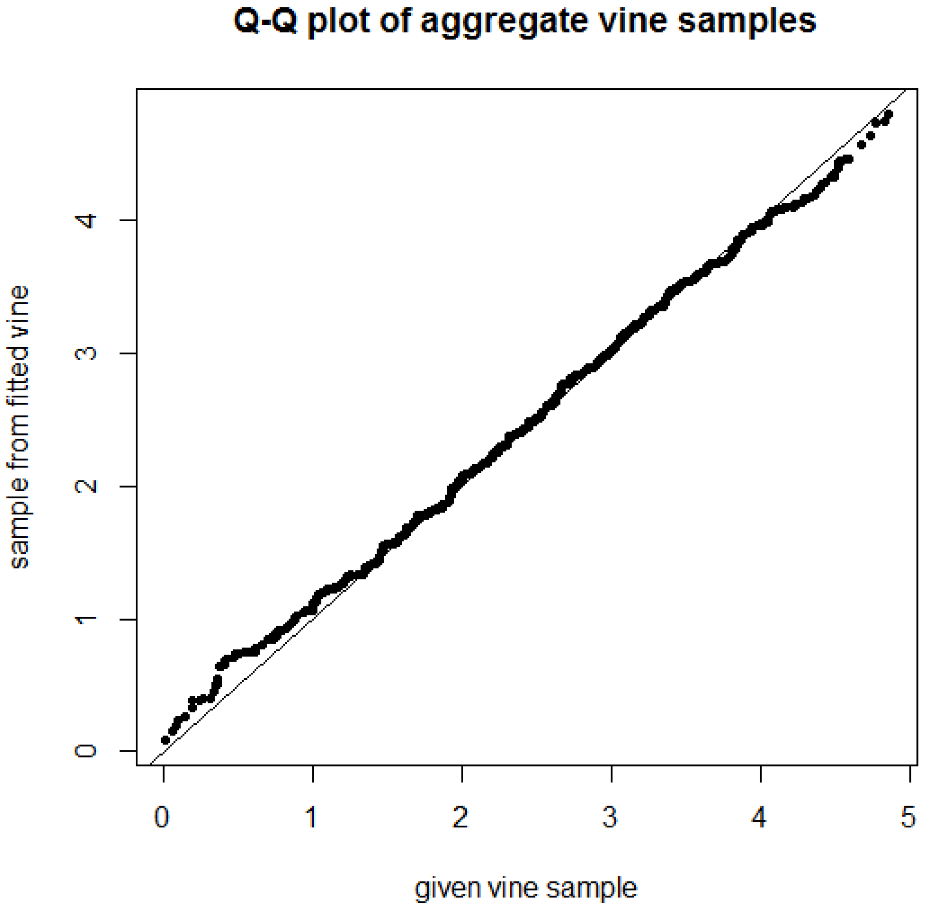 Figure 4 plots the quantiles of the aggregate given vine sample against the quantiles of the aggregate sample from the fitted vine copula. On the aggregate portfolio level, the overall fit appears to be rather good, which implies that we can tolerate some deviations in bivariate copula parameters given that the selected tree structure and copula families are pretty good.