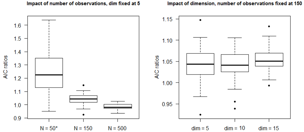 Interestingly, the copula dimension hardly has any effect on estimation performance (which is quite comforting for our plan to use vine copulas in dimension 40 and 75). When the copula dimension is increased by a factor of three (from five to 15), the average AIC ratio hardly changes (from 104% to 105%). We can easily explain the estimation’s robustness towards the dimension by looking at the ground level trees of the vine: no matter what the dimension is, at each bivariate estimation step, there is a 150 × 2 observation matrix available to estimate the bivariate copula from. Obviously, the estimation results of the ground level trees do not deteriorate if we repeat the bivariate copula estimation with increasing dimension. The same argument holds for the higher level trees. Figure 5 presents boxplots of the 50 AIC ratios underlying each average value of Table 1. The boxplots support our conclusion that estimation performance increases with number of observations and that the copula dimensions have hardly any effect.