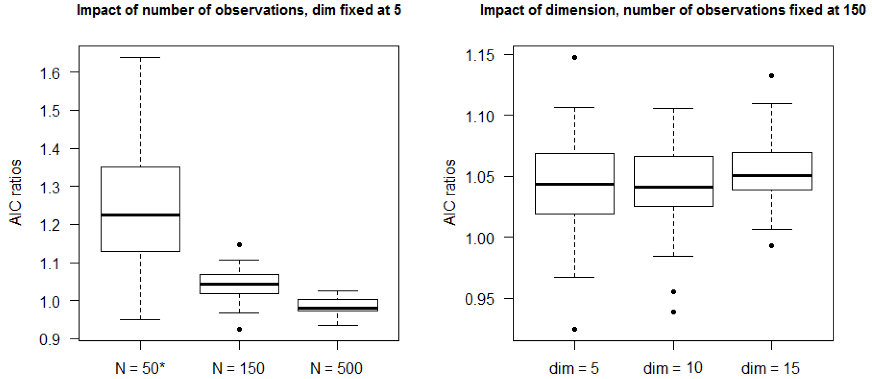 Figure 5 presents boxplots of the 50 AIC ratios underlying each average value of