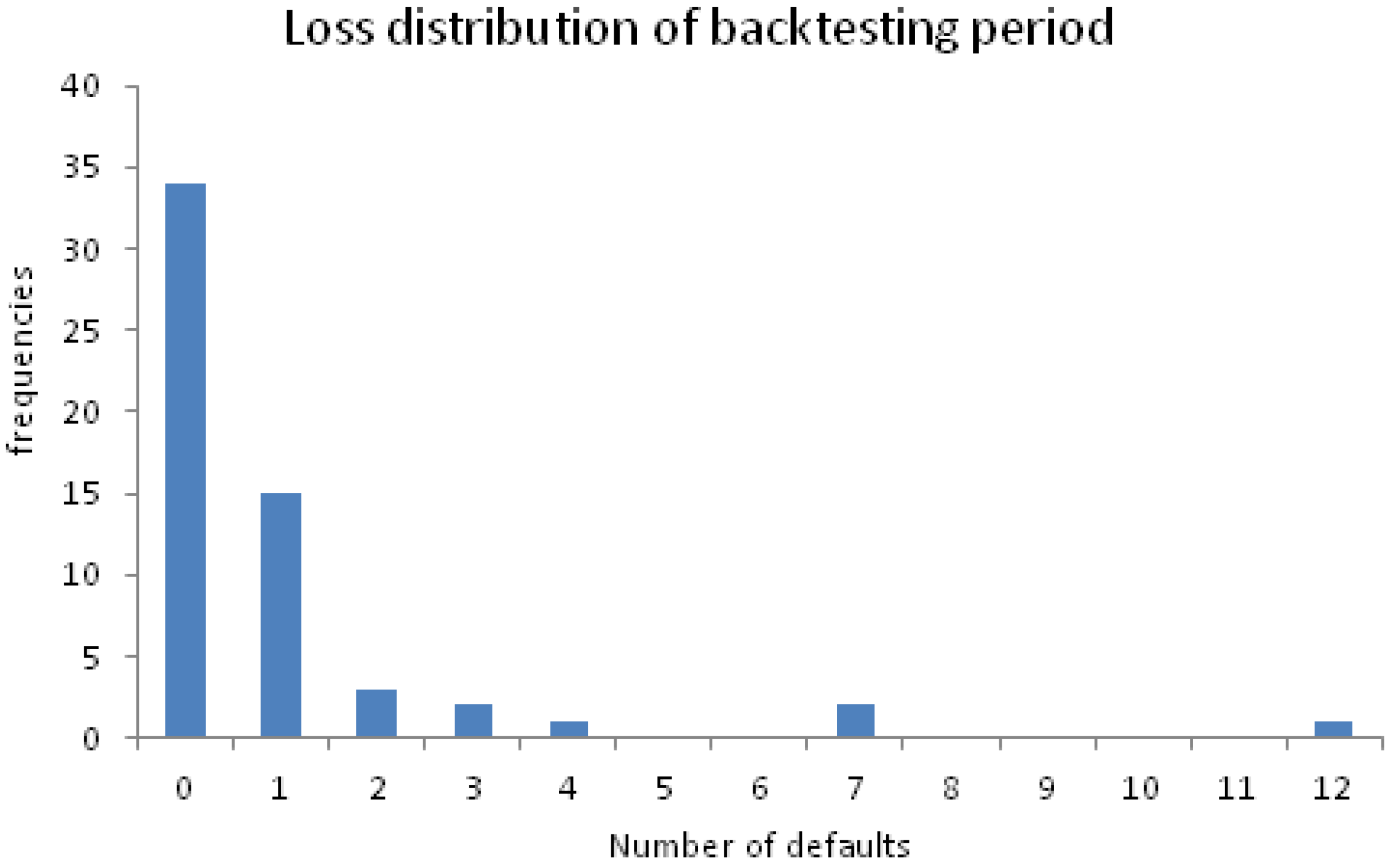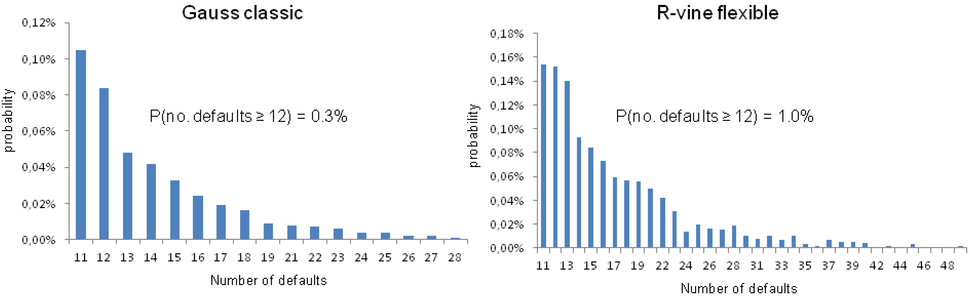 Figure 7 shows how many model-implied defaults occurred in the portfolio per month in the backtesting period (April 2011 to January 2016, 58 observations). For example, in 34 of the 58 backtesting months, no default occurred and the maximum number of defaults in a given month was twelve, which occurred once. Now, observing twelve defaults once in our backtesting period of 58 months is obviously closer to the prediction made by the flexible R-vine (1:100) than it is to Gauss copula prediction (3:1000). Our little backtesting analysis supports the well-known fact that the Gaussian copula is not suited to model portfolio tail events properly, while a flexible R-vine copula seems to do a way better job in this regard.