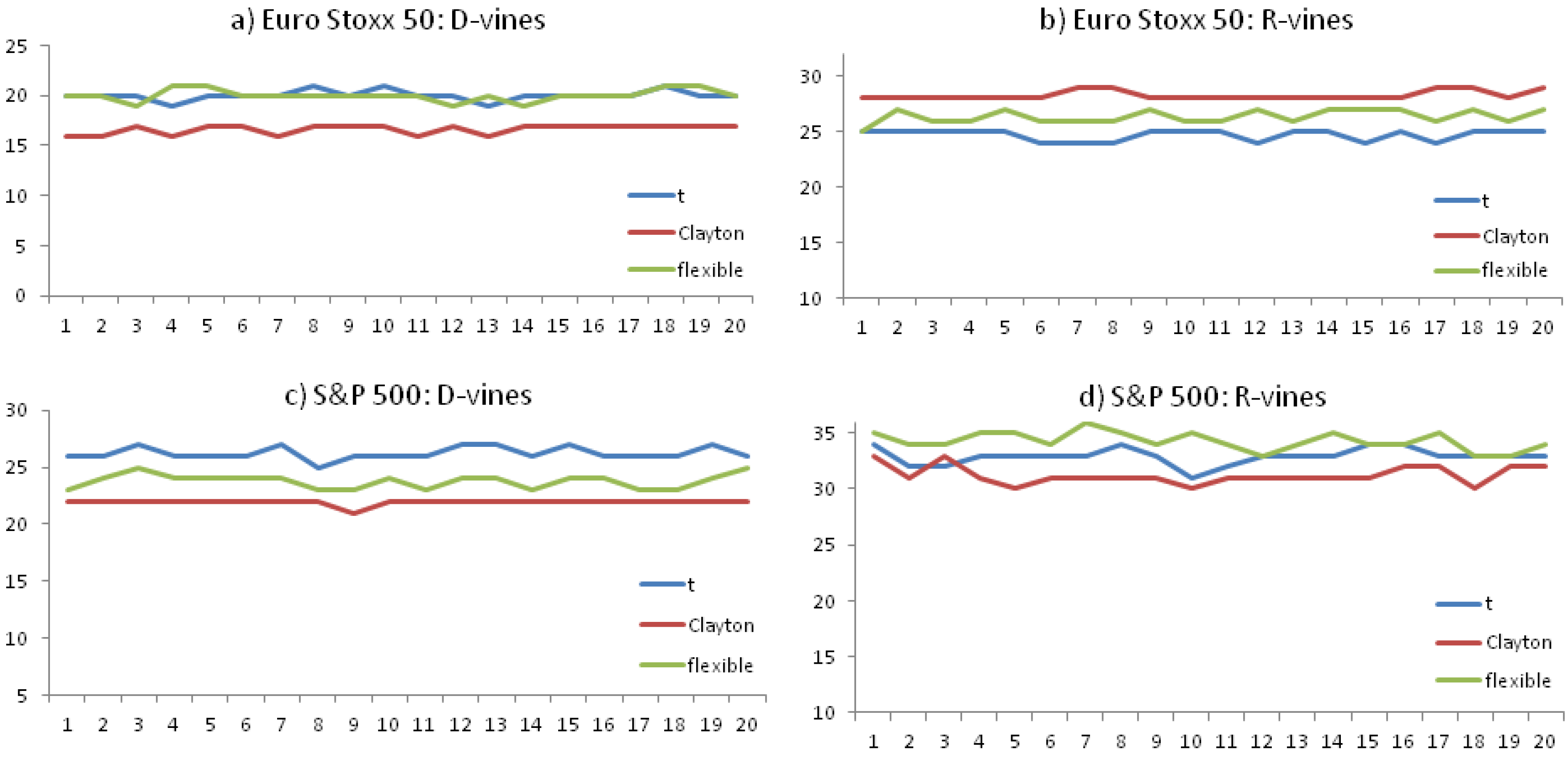 Table 2 presents the AIC for conventional copulas, D- and R-vines for both portfolios. The first three rows refer to vine copulas where all bivariate copula are taken from the family given in the very first column, whereas, in the flexible construction, the copula family with the highest AIC is chosen in each bivariate estimation step. Looking at the traditional copulas, we see that for both portfolios, the t copula clearly outperforms the Gaussian and the Clayton copula (e.g., Euro Stoxx: −3.184