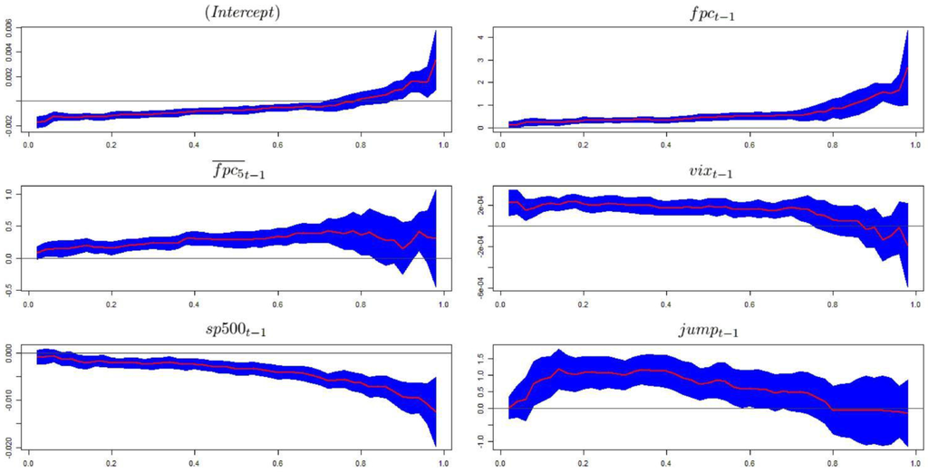 We also built Model (5) to predict the conditional quantiles of the FPC computed on the realized range-based bias corrected bipower variations of the 16 assets. The forecasts, produced for a single step ahead, provide relevant details for the covariates’ prediction abilities.