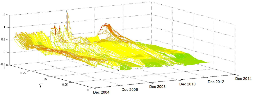 Figure 4 shows two periods in which the coefficient has high values: between the end of 2008 and early 2010 and a shorter period from the end of 2011 to the first half of 2012. While, in the first period, the impact of significantly increases for all τ levels; in the second period, the increase in the coefficient affects just the surface region in which τ takes high values. Unlike the HAR coefficients described above, the coefficient does not have a clear and stable increasing trend over τ. In addition, the relationship between the conditional quantiles and is highly sensitive to the subprime crisis when pessimism among financial operators, reflected in the implied volatility of the S&P 500 index options, was acute. This result is again somewhat expected because we focus on U.S.-based data, and the subprime crisis had a high impact on the U.S. equity market. Our results are evidence that the perception of market risk has a great impact on the evolution of market volatility (as proxied by ), particularly during financial turmoil. The impact is not so clear-cut during the European sovereign crisis, which had less effect on the U.S. equity market.
