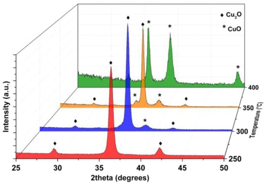 A complete overview of the X-ray diffraction (XRD) analysis of copper oxide thin films deposited by MOCVD in the 250–400 °C temperature range is reported in Figure 1. At the lowest temperature of 250 °C, the pattern (red line) exhibits peaks at 29.64°, 36.50° and 42.43°, which can be assigned to the 110, 111 and 200 reflections of the pure, polycrystalline cuprite phase (PDF card n. 077-0199). At a deposition temperature of 300 °C, the pattern (blue line) presents an additional peak at 38.89°, which can be ascribed to 111/200 reflections of CuO traces. In fact, at higher temperatures (350 °C—orange line) together with the previous one, the additional peak at 35.58° points to the formation of a mixture of Cu2O and CuO phases. Finally, at 400 °C, the pattern in green shows the formation of the pure tenorite phase CuO, with the presence of signals at 35.57°, 38.92° and 48.80° related to the 002, 111/200, and -202 reflections, respectively (PDF card n. 00-045-0937), while no peaks related to Cu2O are present.