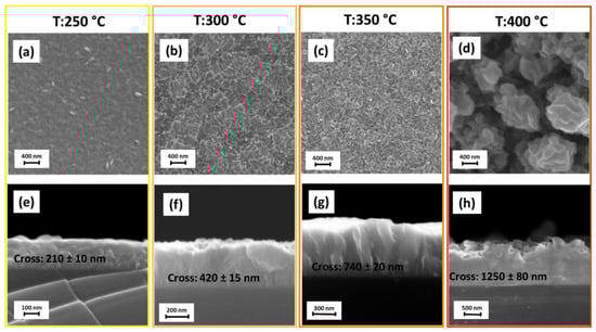 FE-SEM images of Cu2O and CuO thin films prepared by MOCVD on Si substrate deposited at 250 °C: (a) plan view and (e) cross-section; at 300 °C: (b) plan view and (f) cross-section; at 350 °C: (c) plan view and (g) cross-section; at 400 °C: (d) plan view and (h) cross-section.