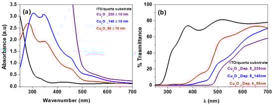 The absorbance spectra in the UV-vis range of the ITO/quartz substrate and the Cu2O_230 nm, Cu2O_140 nm and Cu2O_90 nm films are displayed in Figure 4a. The absorbance spectra show high transparency up to 300 nm for the ITO substrate, and an absorption edge localized between 450 and 500 nm for the Cu2O films, which corresponds to the excitonic band gap of Cu2O films. The spectra of the Cu2O_230 nm, Cu2O_140 nm and Cu2O_90 nm films display an increase in absorbance as a consequence of the thickness increase, a behavior already observed for films grown with different techniques []. Transmission spectra of ITO/quartz and Cu2O thin films are reported in Figure 4b, while in Figure S3 the transmission of the ITO/quartz annealed at 250 °C is compared to the untreated ITO/quartz substrate. Regardless of thickness, all Cu2O films absorb strongly in the UV-vis region between 250 and 450 nm, resulting in a drop in the percentage of transmission. As the thickness of the hole transporting layer is significantly reduced, the transmittance in the visible range increases. In fact, up to λ = 480 nm, the transmittance for the thickest Cu2O_230 nm and Cu2O_140 nm is minimal and then begins to rise, reaching only 20% for the Cu2O_230 nm and 40% for the intermediate Cu2O_140 nm at λ = 500 nm. Cu2O_90 nm thin film, on the other hand, achieves acceptable transmittance levels (about 60%) at λ = 450 nm and reaches a higher 70% at λ= 650 nm. The present results agree with the literature data [,], and point to the potential applicability of the presently grown Cu2O film as an HTL layer for photovoltaic applications [].