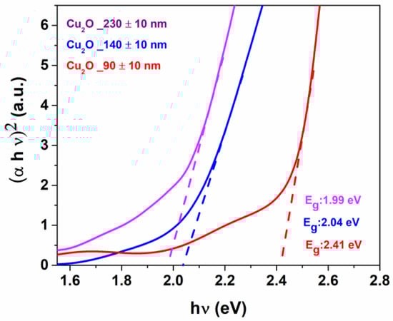 Tauc’s plot obtained from the relation of (αhν)2 versus (hν) is calculated from the optical measurements reported in Figure S4 for the ITO/quartz substrate and in Figure 5 for the Cu2O films. Using a linear extrapolation, the values of the direct optical band gap of the Cu2O_230 nm, Cu2O_140 nm and Cu2O_90 nm films are evaluated to be 1.99, 2.04 and 2.41 eV, respectively. In order to evaluate the reproducibility of the process and to have statistically significant results, the band gaps from three different samples for each deposition condition of the films Cu2O_230 nm, Cu2O_140 nm and Cu2O_90 nm have been extrapolated yielding average values of 1.97 ± 0.02, 2.03 ± 0.03 and 2.37 ± 0.06 eV, respectively. It is interesting to note that the band gap increases upon decreasing film thickness. This band gap spreading effect has been previously observed for Cu2O films [] and in similar thin film studies [,].