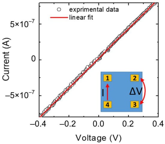 As an example, Figure 6 shows a typical current-voltage (I-V) measurement carried out on a Van der Pauw structure fabricated on the Cu2O sample. The inset in Figure 6 shows schematically the geometry of the sample and the I-V measurement setup. From the linear fit of the experimental data, the sheet resistance RSH of the Cu2O films has been determined.