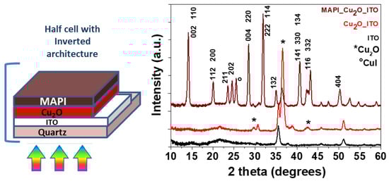 X-ray diffraction patterns of ITO substrate (black line), Cu2O thin film prepared by MOCVD on the ITO substrate at 250 °C (red line) and the multilayer system MAPI/Cu2O/ITO substrate (brown line). The * indicates the Cu2O peaks. On the left, a cartoon is shown of the planar inverted architecture realized up to the MAPI deposition.