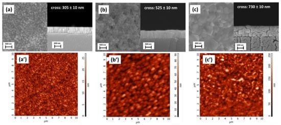 Finally, the atomic force microscopy (AFM) characterization of the three layers (Figure 8a’–c’) confirms the homogeneity of the films as well with fully coalesced grains on a larger area of 10 μm × 10 µm, and a root mean square (RMS) roughness of about 2.9 nm, 8.9 nm and 26.6 nm (measured on areas of 4 μm × 4 μm) for ITO, Cu2O and MAPI films, respectively. The RMS roughness values of three different Cu2O samples, deposited under the same conditions of the Cu2O_230 nm, range from 7.8 to 10.1 nm. The low RMS roughness of the Cu2O layer is comparable to literature data on films grown on Si, further confirming these films as suited for the growth of the perovskite layer.
