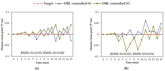 To demonstrate the influence of transfer learning, the DRL agent was trained in two ways: without initializing the weights from a pre-trained model (termed S3 for simplicity) and with weights initialized using the previously trained model (termed S3TL). Figure 10 shows groundwater control outcomes for S3 and S3TL during the four types of rainfall events. Figure 10a only includes the result of S3, because the first training step with the 15-min-constant rainfall event had no previously trained model. As shown in Figure 10b–d for the three rainfall events, the RMSE values for training using transfer learning (S3TL) were lower than the values for training without any knowledge (S3). Lower values of RMSE indicated that the training with transfer learning can better regulate the groundwater and keep the water level closer to the target level. Furthermore, by comparing Figure 10a–d, it was observed that the distance from the target level was reduced as the agent gained more experience in controlling the water table during different rainfall events. This investigation confirmed the efficiency of the transferred knowledge in improving the groundwater control as the agent trains with more rainfall events.