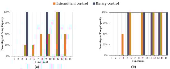 Selection of actions to regulate the pump’s flow rate using binary and intermittent control during rainfall events: (a) 15-min-constant; (b) 15-min-normal; (c) 20-min-descending; (d) 25-min-ascending.
