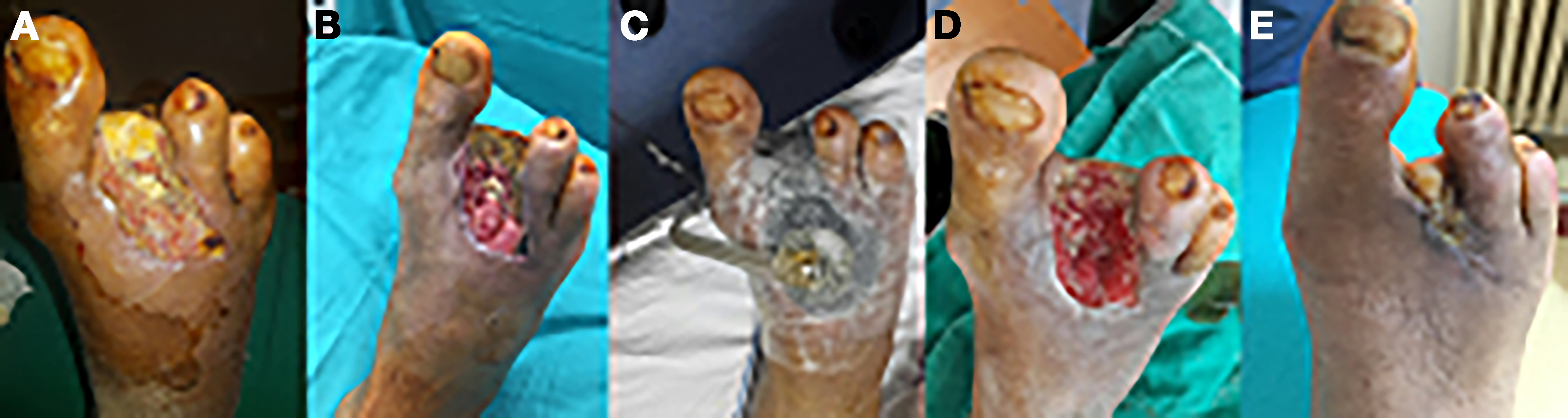 A, Wagner grade 3 diabetic foot ulcer (DFU). Infection and necrosis are seen. B and C, The DFU after debridement and wound side revision. D, Application of negative pressure wound therapy. E, The DFU after the intralesional epidermal growth factor injections.