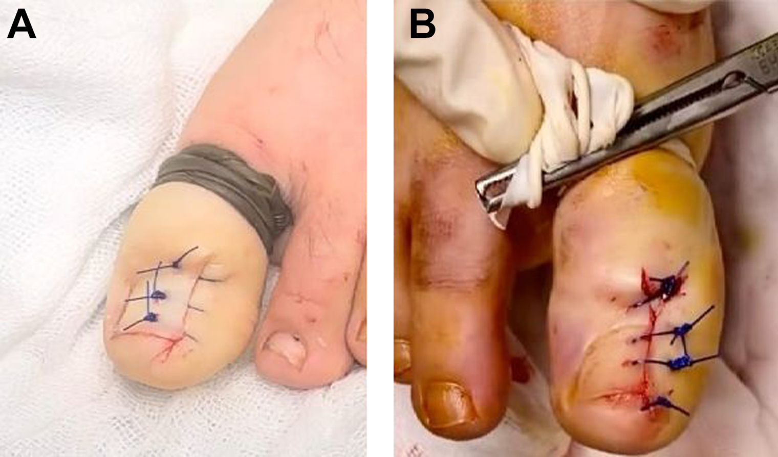 (A) New suture technique. (B) Traditional suture technique.
