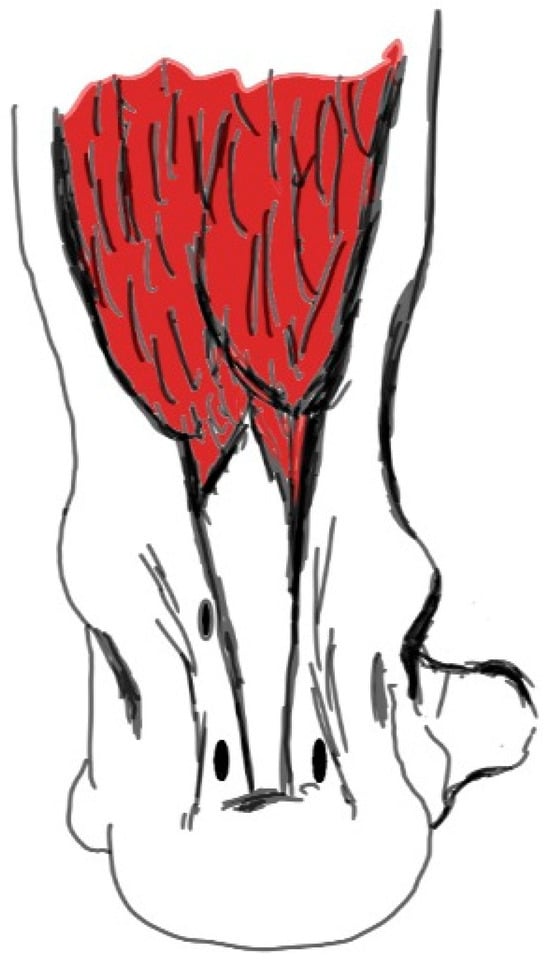The patient was positioned in the prone position under spinal anesthesia. Standard posteromedial (PM) and posterolateral (PL) portals, commonly used in posterior ankle arthroscopy, were employed (Figure 1). Utilizing the PL portal as the viewing portal, the retrocalcaneal space was debrided using a 4-mm arthroscopic shaver (Stryker Corporation, Kalamazoo, MI, USA) introduced through the PM portal. The subtalar joint was visualized, and the flexor hallucis longus (FHL) retinaculum was opened just medial to the lateral talar process. Subsequently, the FHL tendon was identified and visualized. The FHL muscle belly posterior to the talus and distal tibia was exposed. Following the method described by Boszczyk et al. [4], a window was created in the interosseous membrane, and the distal portion of the FHL muscle belly was resected using a shaver to prevent impingement (Figure 2).