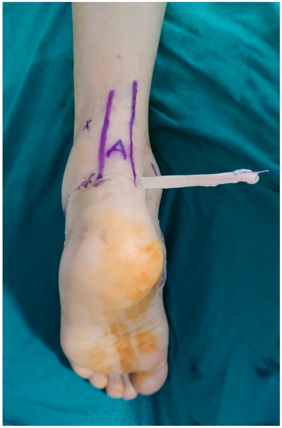 Under fluoroscopy, the position of the middle cuneiform was determined. A 1 cm skin incision was made at the level where the tenodesis would be applied. Using a clamp, a tunnel was created beneath the skin and over the extensor retinaculum for the passage of the FHL tendon. The FHL was passed through this tunnel. Subsequently, a 6 mm-wide bone tunnel was created dorsally to plantarly on the middle cuneiform using a drill. The FHL tendon was passed through the tunnel with the aid of sutures. With the ankle in a neutral position, tenodesis of the FHL to the middle cuneiform was achieved using biovida. The skin incisions were closed using non-absorbable monofilament sutures, and a short leg cast was applied to the patient.