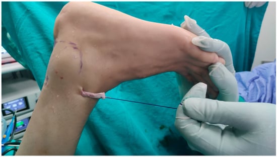 Approximately 10 cm proximal to the PL portal, a 0.5 cm portal was created (Proximal Posterolateral Portal: PPL). Through this hole, a curved-tip clamp was inserted, and a percutaneous window was created in the interosseous membrane. At the level where the tendon would pass through the interosseous membrane, a 0.5 cm skin incision was made on the anterior aspect of the ankle. The FHL tendon was sutured distally, and using a thread, it was first moved to the PPL (Figure 6). Then, with the aid of the clamp, it was passed through the percutaneous window in the interosseous membrane and transferred from the skin incision on the anterior aspect of the ankle to the anterior aspect of the ankle (Figure 7).