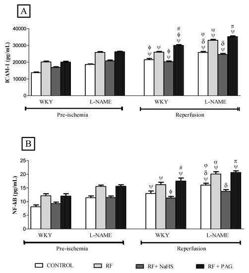 A significant increase (all p < 0.05) in NF-kB concentration was observed in the reperfusion phase with approximately 60% in WKY-CONTROL, 33% in WKY-RF, 22% in WKY-RF+NaHS, 45% in WKY-RF+PAG, 40% in L-NAME-CONTROL, 29% in L-NAME-RF, 19% in L-NAME-RF+NaHS and 32% in L-NAME-RF+PAG when compared to their corresponding groups in the pre-ischemia phase (Figure 7B). Prophylactic treatment with NaHS caused a 28% decline (p < 0.05) in NF-kB concentration in WKY-RF+NaHS when compared to WKY-RF and a 56% decline in comparison to WKY-RF+PAG. Similarly, NaHS treatment caused a 30% decline (p < 0.05) in NF-kB concentration in L-NAME-RF+NaHS when compared to L-NAME-RF and a 53% decline in comparison to L-NAME-RF+PAG. It was noticed that WKY-RF had a significantly increased (p < 0.05) NF-kB concentration by 17% in comparison to WKY-CONTROL while L-NAME-RF had a significantly increased NF-kB concentration by 18% in comparison to L-NAME-CONTROL. Similarly, L-NAME-CONTROL had significantly increased (all p < 0.05) ICAM-1 concentration by 17% when compared WKY-CONTROL.