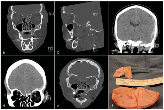 CT scan of Patient 1: face, head, and brain with 1 mm slices. (a) Coronal view of bilateral minimally displaced orbital roof fractures. (b) Sagittal view of the left orbital roof fracture, which was more depressed than the right. (c) Coronal view of the left subdural hematoma (SDH) with 3 mm midline shift. (d) Coronal view of the left orbital encephalocele. (e) Coronal view of the bilateral orbital roof repair with split calvarial bone grafts. (f) Intraoperative picture of split calvarial bone grafts from the inner table of the patient’s frontal bone.
