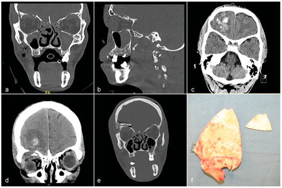 CT scan of Patient 2: face, head, and brain with 1 mm slices. (a) Coronal view of bilateral minimally displaced orbital roof fractures. (b) Sagittal view of the comminuted right orbital roof fracture, which was more depressed than the left. (c) Axial view of the right frontal lobe contusion. (d) Coronal view of the right orbital encephalocele with right frontal lobe contusion and worsening fracture displacement, on hospital day 4. (e) Coronal view of the right orbital roof repair with split calvarial bone graft. (f) Intraoperative picture of split calvarial bone graft from the inner table of the patient’s right frontal bone.