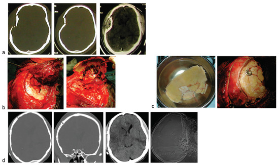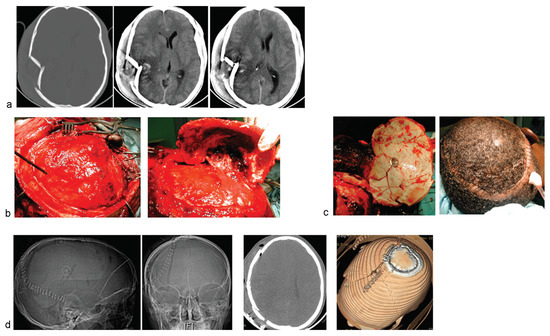 - Li, X.; Qian, C.; Yang, S.; Chen, Y.; Sun, W.; Wang, Y. Cranial reconstruction with titanium clamps in frontal comminuted depressed skull fractures. J Craniofac Surg 2013, 24, 247–249. [Google Scholar] [CrossRef] [PubMed]