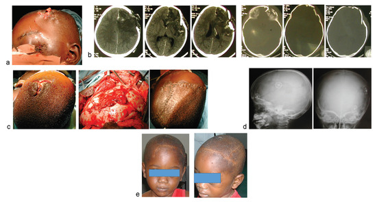 For this implant neurosurgery, we exercise a heightened concern for surgical site infection (SSI). Hence, extra efforts are made to maintain surgical asepsis all the way. Our choice of perioperative prophylactic antimicrobial is ceftriaxone, a third-generation cephalosporin. A high dose, 2 g in adults, is given at induction of anesthesia, and continued till 48 hours postoperatively. The same cephalosporin, as well as gentamycin, is mixed with the intraoperative surgical field irrigation fluid. In cases with associated dirty open wound, a social toileting with soapy lotions such as chlorhexidine and generous plain-water irrigation are first applied, mopped dry before the proper surgical site prepping is done, and the surgical incision line is isolated with surgical sterile drapes. Figure 1, Figure 2 and Figure 3 illustrate the essential elements of the surgical steps for the use of the titanium clamps in this surgical procedure. First, standard scalp flaps (Figure 1 and Figure 2) or extension of overlying scalp lacerations (Figure 3) are raised to expose the cranial-facial fracture lines. For elevation of the fracture fragments, attempts are made to achieve osteotomies and calvarial craniotomies that include intact bone segments to facilitate the reassembly of the fracture fragments (Figure 1 and Figure 2) [3,4]. Loose fracture fragments that are sizeable enough to handle are harvested, while very tiny fragments are discarded. Then generous debridement of the fracture fragments to be reassembled is performed either onsite for those still attached, or side table for the loose ones. The debridement involves scrupulous scraping, especially of any exposed diploeic layer, with appropriate size bone curettes and wet sponges, and simultaneous generous irrigation with antibiotic-laden normal saline solutions. The bone fragments, usually pristine after this scraping and scrubbing, are then soaked in the same antimicrobial-laden solutions (Figure 2c) while other necessary intracranial work, extra- and/or intradural, is performed. The latter includes repair of dural tears and evacuation of traumatic brain lesions. Finally, the reassembling of the fragments is done, the aim always being autologous osteosynthesis. The bone fragments are brought on-site, sometimes actually force-impacted into position, and are held together by the titanium clamps. The latter are positioned between the bone fragments, and a single 16-mm CranioFix clamp is sometimes able to hold some four bone fragments together by so doing [3,5]. The whole construct of the assembled bone fragments is then held to the adjoining craniotomy flap or the rest of the cranium with another piece of the titanium clamp. This way, on average approximately three clamps are required to complete the reconstruction. We are very conservative in the number of the clamps used due to economic reasons. The operative field is finally given another generous irrigation, and the surgical wound is closed as usual.
