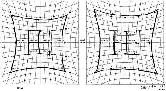 Figure 4. Upper and lower gaze of eye movement in Hess chart. Restricted gaze in left eye.