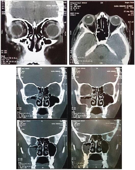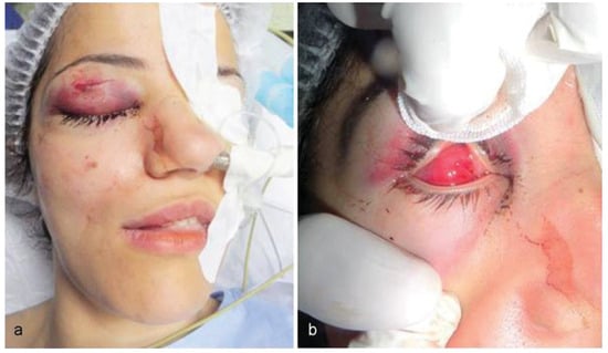- Tranfa, F.; Di Matteo, G.; Di Salle, F.; Strianese, D.; Bonavolontà, G. Traumatic displacement of the globe into the ethmoid sinus. Am. J. Ophthalmol. 2000, 130, 253–254. [Google Scholar] [CrossRef]