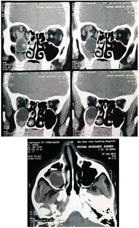 Preoperative coronal and axial computed tomography scan images showing the right globe completely dislocated into the maxillary sinus.