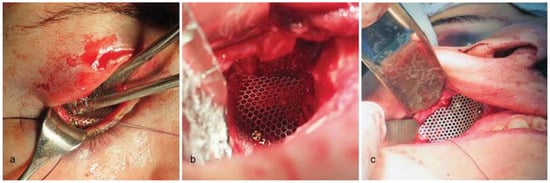(a) Titanium mesh reconstruct orbital floor defect. (b) Second mesh applied through antrostomy to support the globe posteriorly. (c) Maxillary antrostomy repaired by titanium mesh.