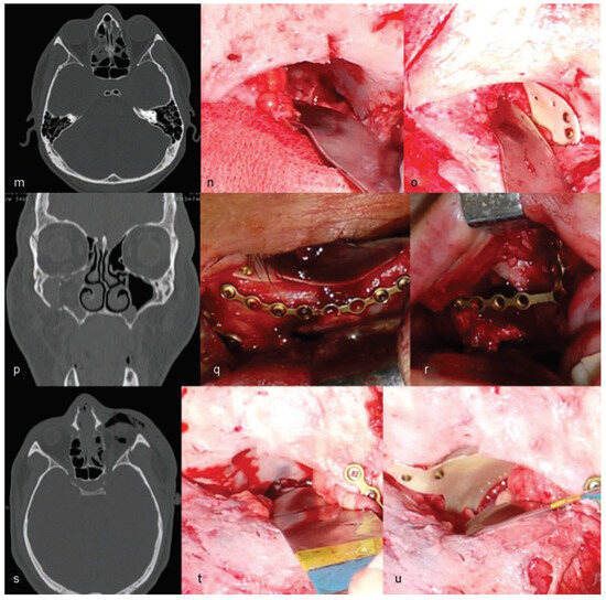 Cases of patients treated with the use of castor oil polymer prosthesis II: (m–o,s–u) Orbital medial wall fractures. (p–r) Orbital floor fractures.
