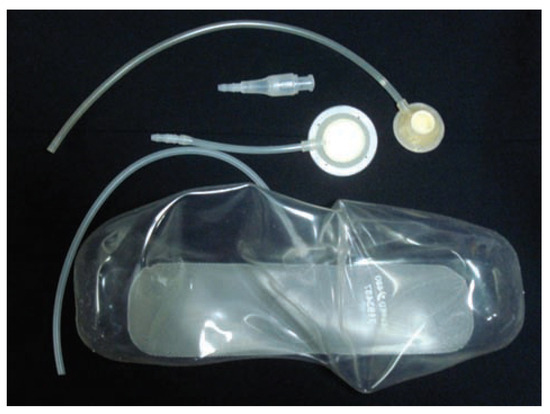 Considering the extensive bone loss and soft-tissue retraction, the installation of a standard type of implantable silicone device for tissue expansion was planned (Figure 4). The device was longitudinally curved and had 480 mL volumetric capacity, with a semi-implanted tissue expander (SILIMED, Comércio de Produtos Médico-Hospitalares, LTDA, Rio de Janeiro, Brazil).