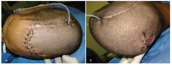 (a,b) Postoperative view, after 28 months of temporoparietal reconstruction. The postoperative result showing the correct contour of the cranial vault.