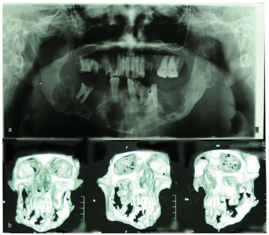 Figure 1. (a) Preoperative panoramic view showing multilocular lesion. (b) 3D CT scan shows massive destruction of the mandible.