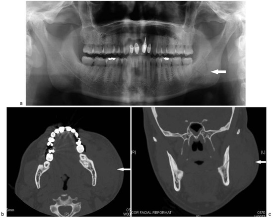 (a) Preoperative orthopanorex showing fracture of left mandibular angle with communication to the periodontal ligament space tooth no. 17. (b) Axial view on CT scan showing left mandibular angle fracture. (c) Coronal view on CT scan showing left mandibular angle fracture.