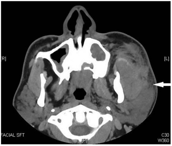- Canosa, A.; Cohen, M.A. Post-traumatic parotid sialocele: Report of two cases. J Oral Maxillofac Surg 1999, 57, 742–745. [Google Scholar] [CrossRef] [PubMed]